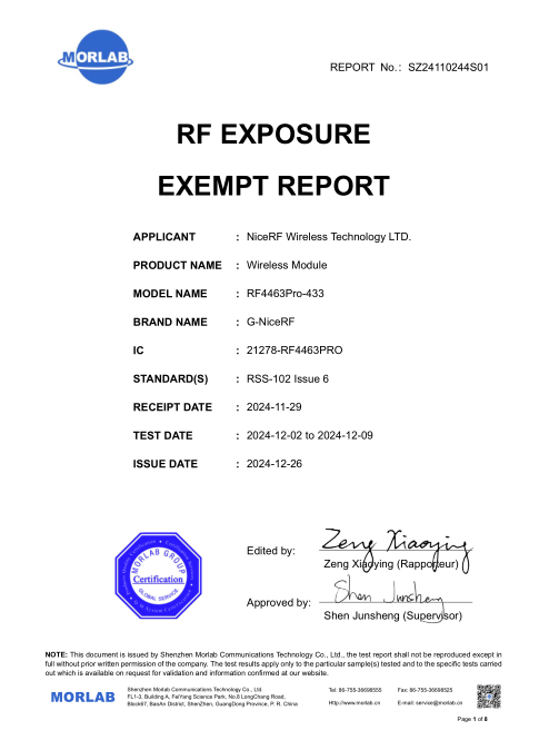 Vollständige Zertifizierungsbericht. Klicken Sie hier, um den detaillierten Anhang von RF4463PRO-433 anzuzeigen .