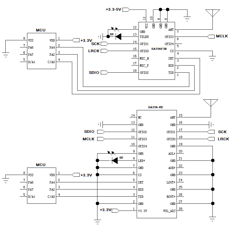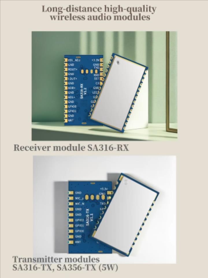 Die Produkte der SA316S-Serie sind in die Sendermodule SA316S-TX und SA316F30 sowie das Empfängermodul SA316S-RX unterteilt. Diese Serie verwendet einen hochwertigen drahtlosen Sprachübertragungschip. Sie unterstützt externe PCM/IIS-Dual-Mode-Digital-Audioschnittstellen und bietet Kunden eine standardisierte serielle Schnittstelle. Anwender können Transceiver-Frequenz, Lautstärke, Mikrofonverstärkung und weitere Parameter des Moduls schnell und einfach über serielle Schnittstellenbefehle einstellen. Dies wird häufig in Situationen eingesetzt, in denen hohe Klangqualität erforderlich ist.